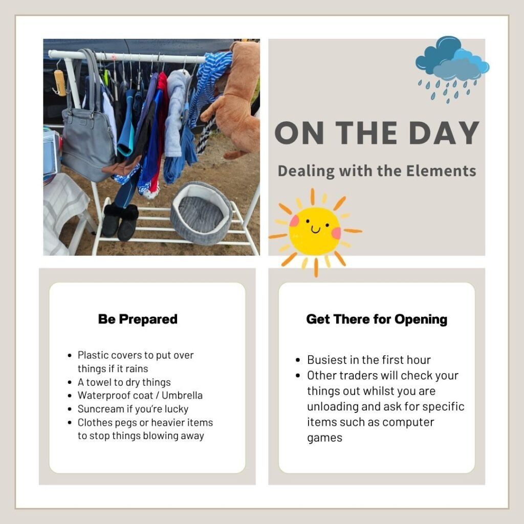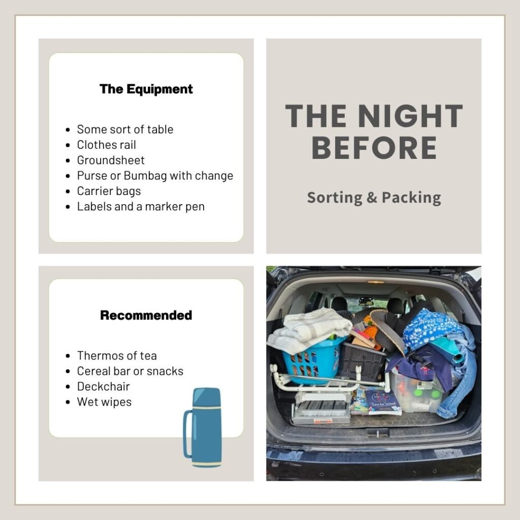 - Load the car with tables and any clothes rails or groundsheets on top where possible, so you can set up straight away, as the ground may be wet