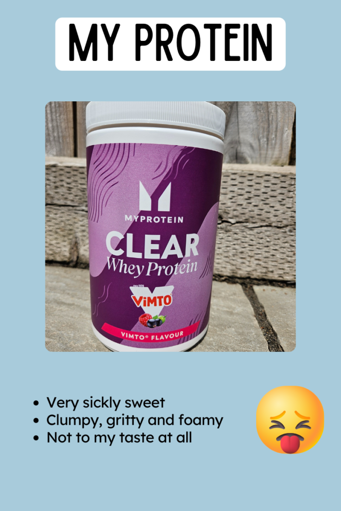 This Vimto-flavoured whey powder was on a clearance offer at Holland & Barrett. My son begged me to get it, despite my discouragement of him taking protein supplements. It was such a reasonable price, I decided to try it, having been nagged into submission. I thought having a fruit- or water-based drink would be a change from milk and more refreshing in the summer. This tasted exactly like Vimto, but it also had a sickly sweet quality. I also spied an anti-foaming agent (silicon dioxide) in it, which I didn’t particularly like the sound of ingesting. Additionally, despite the use of this anti-foaming agent, it wouldn’t mix well for us. It clumped, foamed and tasted gritty. We must have been doing something wrong, but unfortunately, this one is headed for the bin, which feels like such a waste.